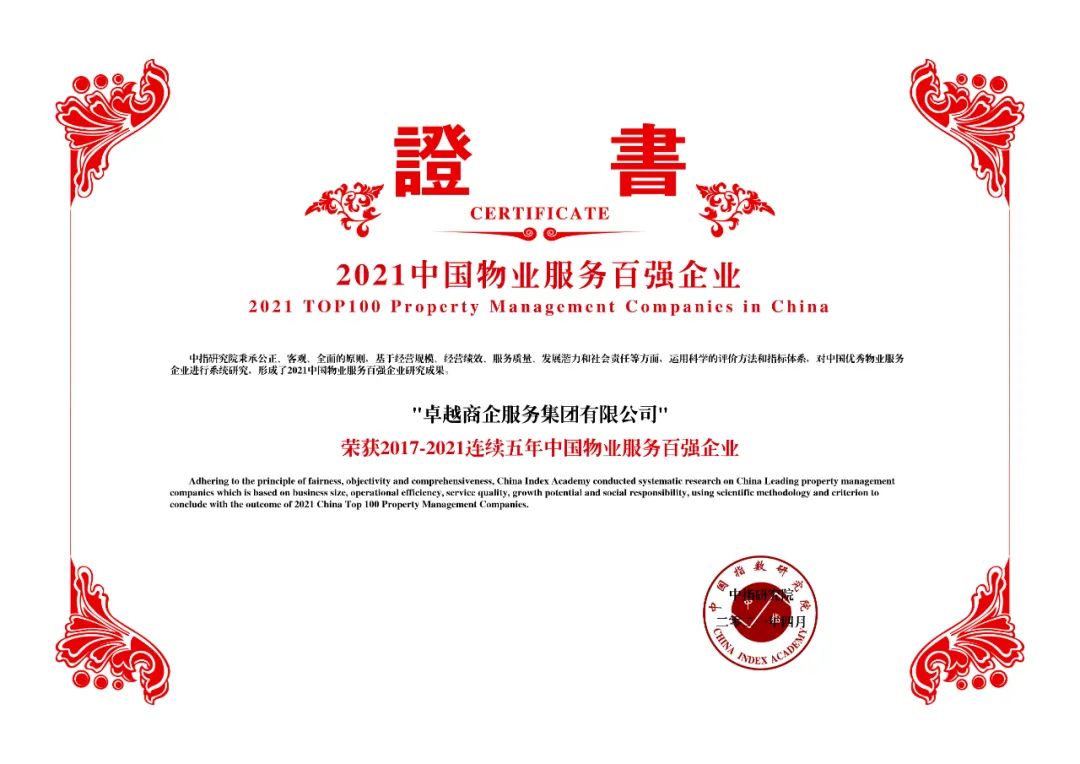 卓越商企服務(wù)集團(tuán)有限公司憑借業(yè)內(nèi)領(lǐng)先的綜合實(shí)力和服務(wù)水平,榮膺“2017-2021連續(xù)五年物業(yè)服務(wù)百?gòu)?qiáng)企業(yè)”,并在專項(xiàng)物業(yè)服務(wù)領(lǐng)域研究中榮獲“2021辦公物業(yè)管理優(yōu)秀企業(yè)”,旗下卓品商務(wù)服務(wù)有限公司榮獲“2021物業(yè)服務(wù)多種經(jīng)營(yíng)優(yōu)秀企業(yè)”。