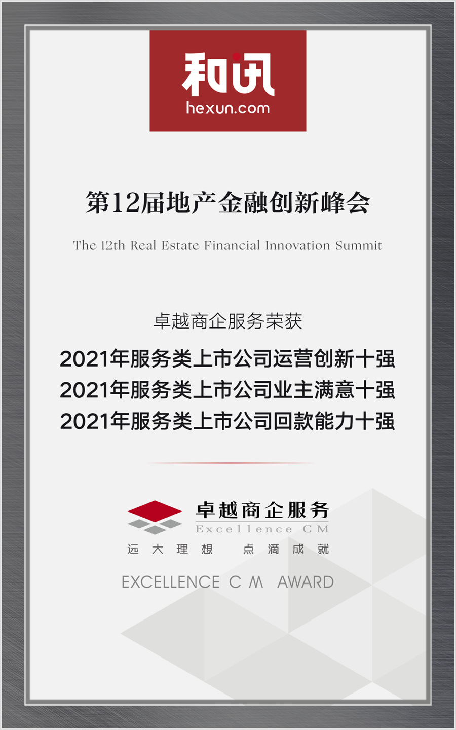 2021年12月16日,由SEEC、和訊網(wǎng)、財經(jīng)中國會主辦的“第十九屆財經(jīng)風(fēng)云榜第12屆地產(chǎn)金融創(chuàng)新峰會”在上海圓滿舉行。卓越商企服務(wù)(6989.HK)斬獲“2021年服務(wù)類上市公司運營創(chuàng)新十強”、“2021年服務(wù)類上市公司業(yè)主滿意十強”、“2021年服務(wù)類上市公司回款能力十強”多項殊榮。同時,祝賀卓越集團榮膺“2021年房地產(chǎn)企業(yè)品牌影響力榜樣”、“2021年房地產(chǎn)企業(yè)優(yōu)秀產(chǎn)品力榜樣”兩項大獎;