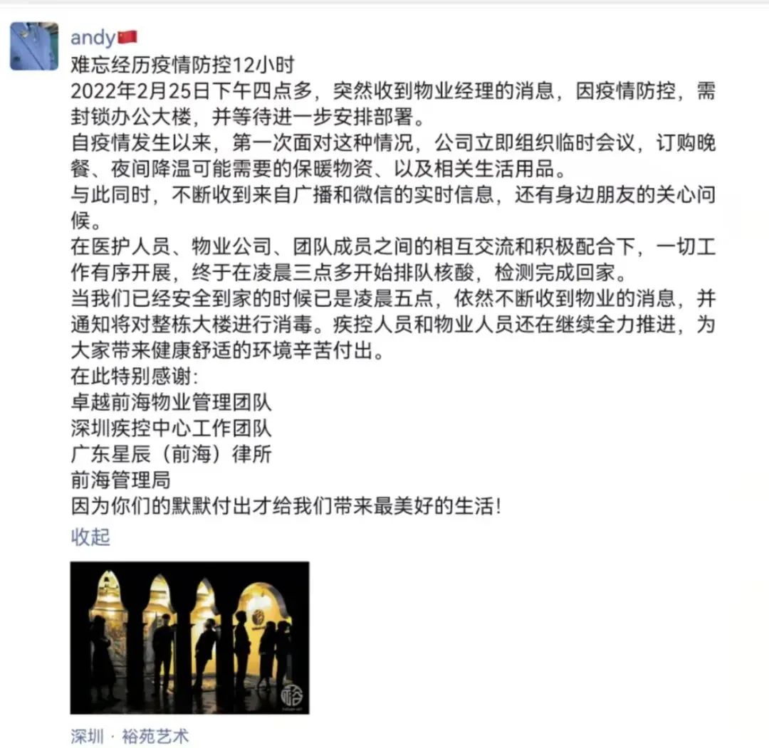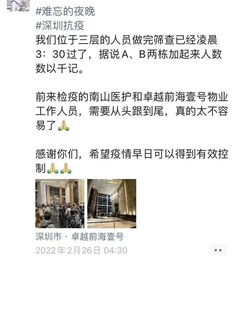 2022年2月25日,卓越前海壹號(hào)3號(hào)樓、7號(hào)樓、8號(hào)樓因疑似病例封控后,項(xiàng)目物業(yè)團(tuán)隊(duì)全程做好客戶安撫、特殊人群信息統(tǒng)計(jì)、協(xié)助核酸檢測(cè)、秩序維護(hù)和后勤保障工作,保障6000多名客戶的衣食住行,直至3月4號(hào)全部解封。