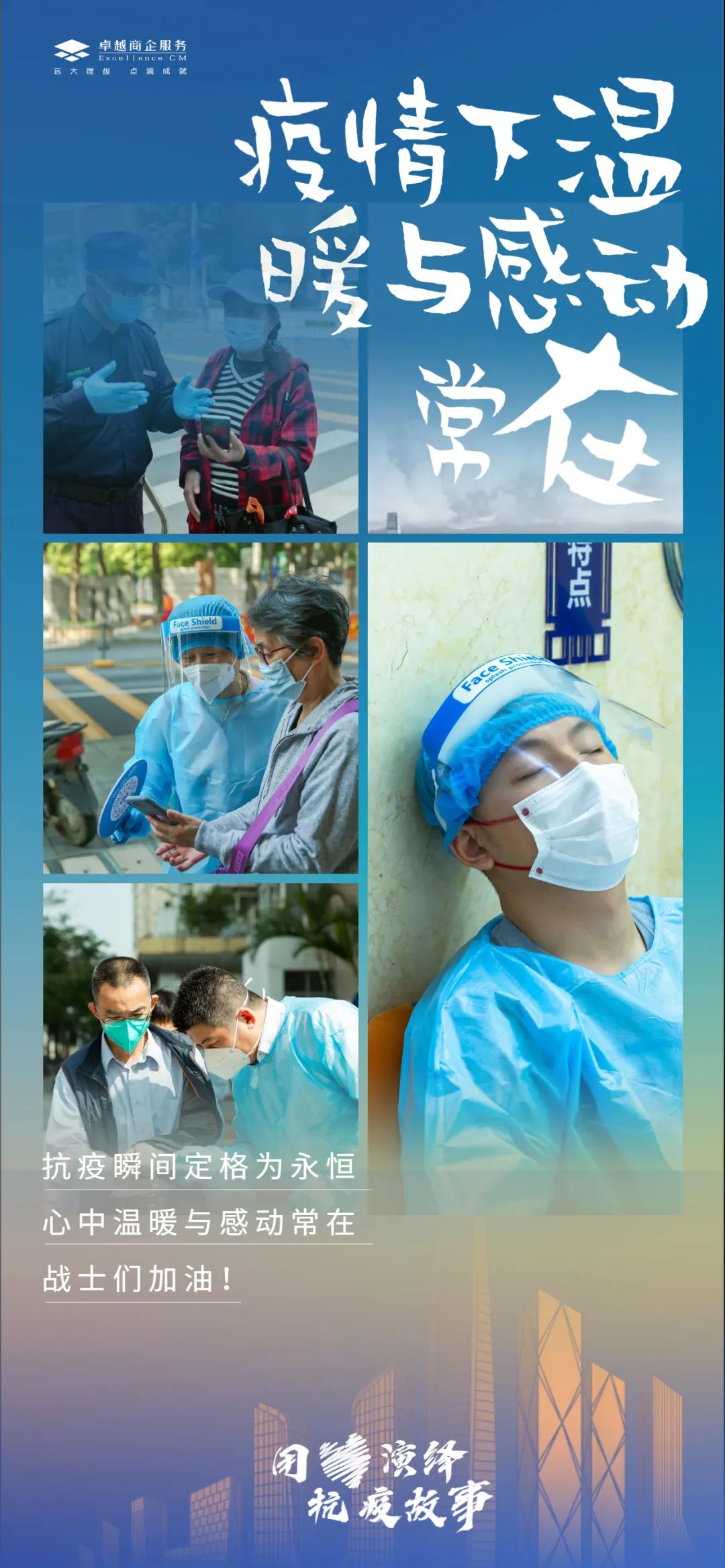 在緊張的疫情狙擊戰(zhàn)場,我們見證了許許多多的溫暖與感動,卓越商企服務(wù)一線人員用他們的堅韌、勇氣、初心為社區(qū)的居民筑牢安全防線,每個社區(qū)角落都在用心演繹著“城市守護(hù)者”的抗疫故事。