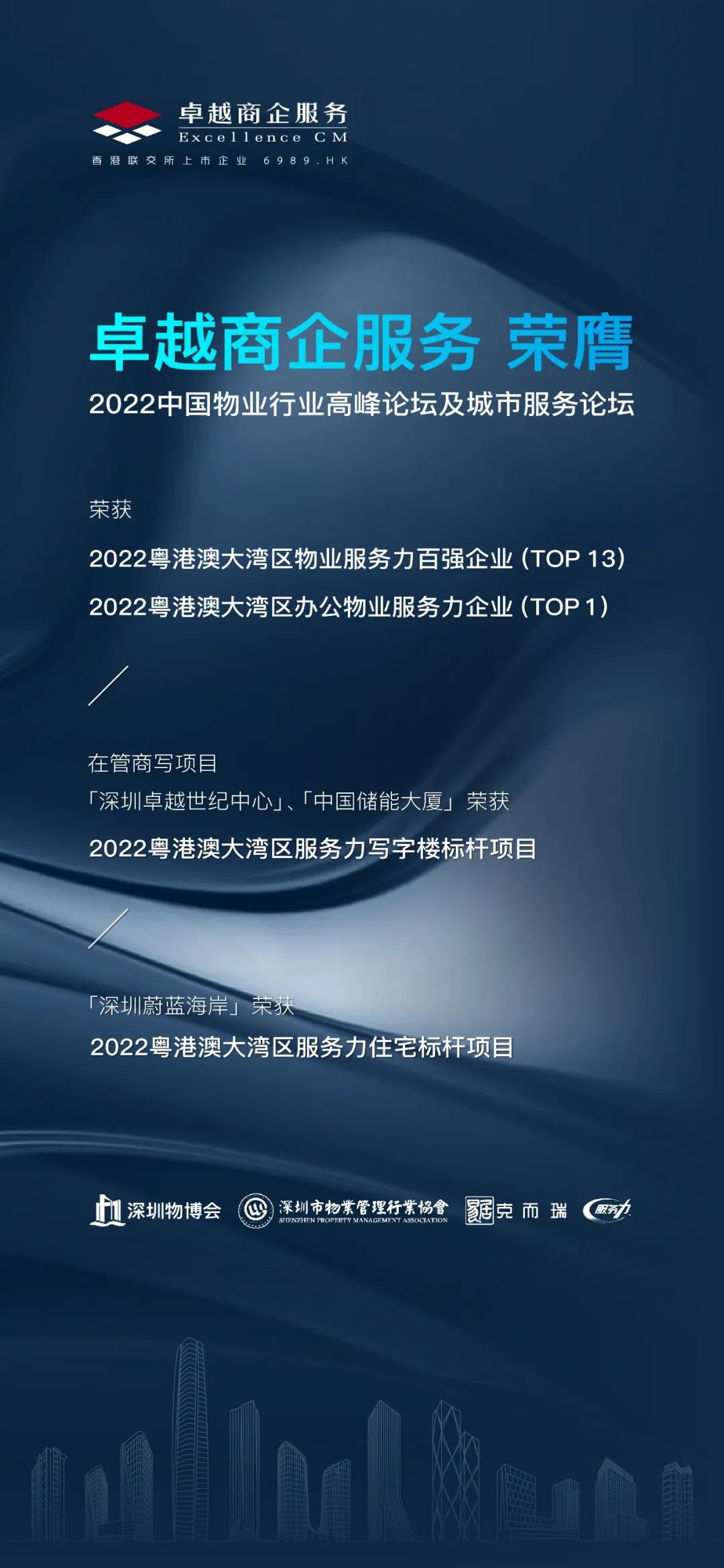 11月21日,2022深圳國(guó)際智慧物業(yè)產(chǎn)業(yè)博覽會(huì)在深圳國(guó)際會(huì)展中心正式開幕。本次物業(yè)博覽會(huì)上,克而瑞物管與中物研協(xié)聯(lián)合發(fā)布2022年度《大灣區(qū)物業(yè)企業(yè)市場(chǎng)及服務(wù)力發(fā)展報(bào)告》。卓越商企服務(wù)憑借在中國(guó)物業(yè)行業(yè)中領(lǐng)先的發(fā)展優(yōu)勢(shì),榮獲 「2022粵港澳大灣區(qū)物業(yè)服務(wù)力百?gòu)?qiáng)企業(yè)(TOP13)」「2022粵港澳大灣區(qū)辦公物業(yè)服務(wù)力企業(yè)(TOP1)」 ,公司在管商寫項(xiàng)目「深圳卓越世紀(jì)中心」、「中國(guó)儲(chǔ)能大廈」榮獲 「2022粵港澳大灣區(qū)服務(wù)力寫字樓標(biāo)桿項(xiàng)目」,「深圳蔚藍(lán)海岸」榮獲「2022粵港澳大灣區(qū)服務(wù)力住宅標(biāo)桿項(xiàng)目」。