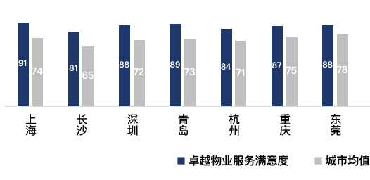 齊頭并進(jìn),2023年,卓越商企服務(wù)旗下住宅業(yè)態(tài)卓越物業(yè)服務(wù)滿意度較2022年持續(xù)提升3%,大幅領(lǐng)先行業(yè)平均水平(高于賽惟調(diào)研行業(yè)總體基準(zhǔn)值14%),在卓越商企服務(wù)重點布局的城市包括上海、深圳、杭州、重慶等一線和新一線城市遙遙領(lǐng)先。