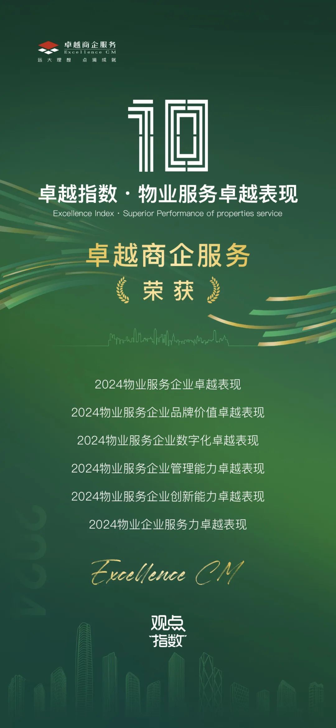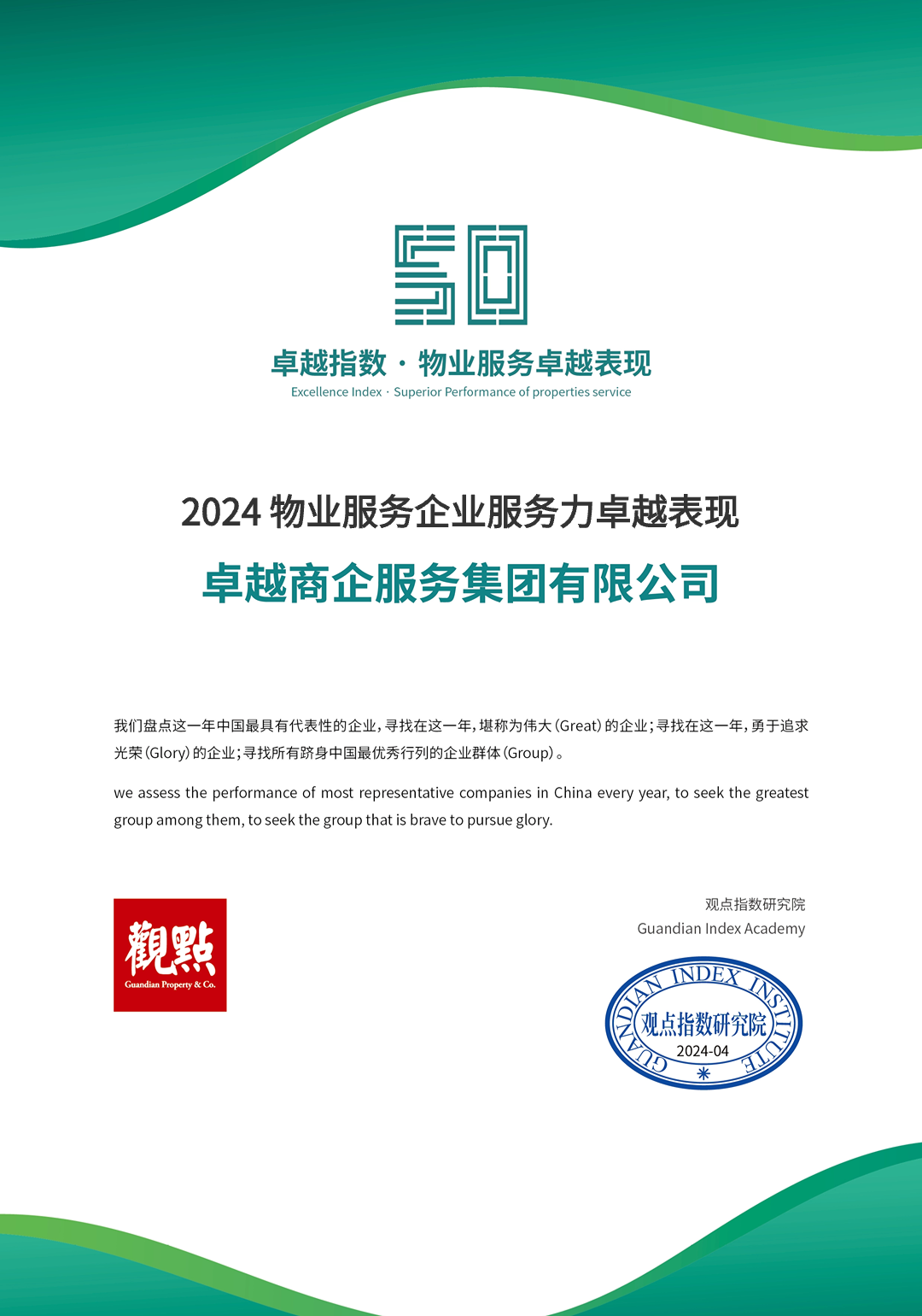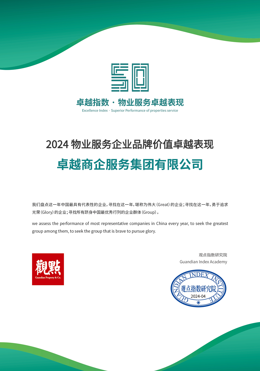 2024年4月11日,由觀點機構(gòu)主辦的「2024觀點物業(yè)大會」在深圳召開。大會現(xiàn)場發(fā)布了《卓越指數(shù) ? 2024物業(yè)服務企業(yè)卓越表現(xiàn)報告》,卓越商企服務憑借行業(yè)領(lǐng)先的優(yōu)勢及卓越的管理能力榮獲 「2024物業(yè)服務企業(yè)卓越表現(xiàn)」、「2024物業(yè)企業(yè)數(shù)字化卓越表現(xiàn)」、「2024物業(yè)服務企業(yè)管理能力卓越表現(xiàn)」、「2024物業(yè)企業(yè)創(chuàng)新能力卓越表現(xiàn)」、「2024物業(yè)企業(yè)服務力卓越表現(xiàn)」、「2024物業(yè)服務企業(yè)品牌價值卓越表現(xiàn)」等多項殊榮!