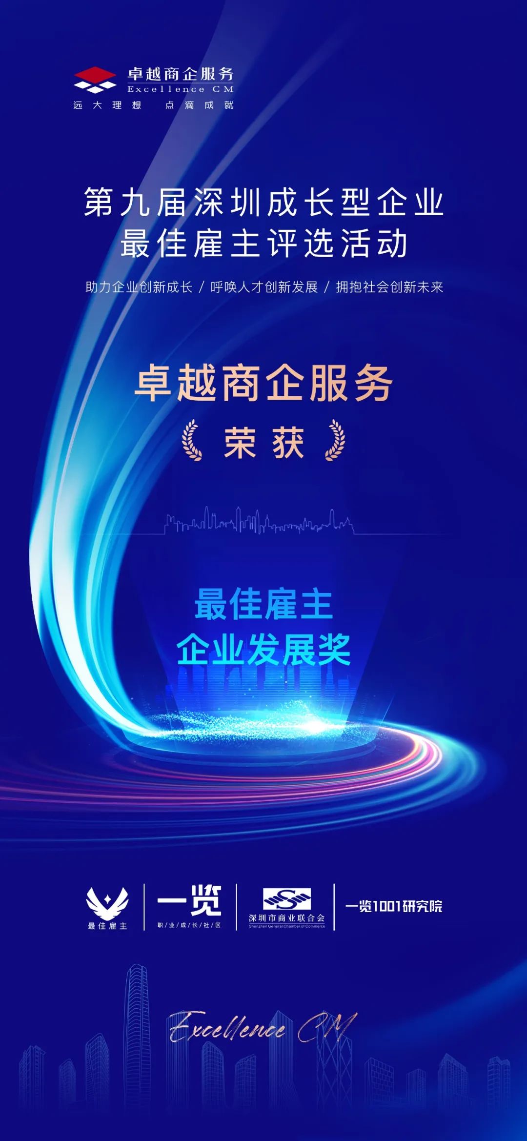 2023年5月11日,由深圳市商業(yè)聯(lián)合會(huì)主辦的「第九屆深圳成長(zhǎng)型企業(yè)最佳雇主頒獎(jiǎng)典禮」在深圳南山圓滿舉行,會(huì)上公布了「第九屆深圳成長(zhǎng)型企業(yè)最佳雇主評(píng)選活動(dòng)獲獎(jiǎng)榜單」,卓越商企服務(wù)憑借在人力資源戰(zhàn)略、人才發(fā)展、ESG發(fā)展、組織創(chuàng)新等方面做出的卓越表現(xiàn),榮獲「最佳雇主-企業(yè)發(fā)展獎(jiǎng)」。作為中國商務(wù)物業(yè)服務(wù)行業(yè)的頭部企業(yè),卓越商企服務(wù)一直將雇主品牌的建設(shè)和發(fā)展作為企業(yè)戰(zhàn)略方針,夯實(shí)人才根基,為員工創(chuàng)造更全面和立體的成長(zhǎng)環(huán)境,推動(dòng)企業(yè)長(zhǎng)遠(yuǎn)發(fā)展。