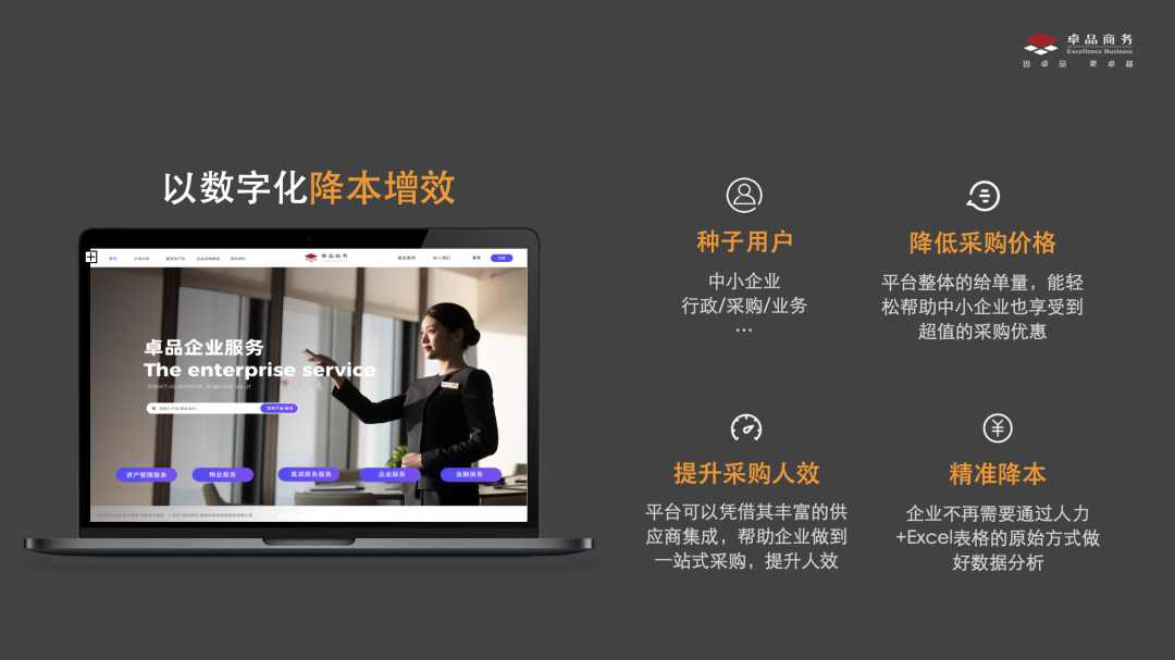 卓越商企服務(wù)旗下卓品商務(wù)打造了三大數(shù)字化平臺(tái),包括:企業(yè)服務(wù)集采平臺(tái)、園區(qū)生活服務(wù)Life商城、員工福利平臺(tái)。依托于多年客戶服務(wù)沉淀出的需求解讀,卓品做好供應(yīng)鏈嚴(yán)選及品質(zhì)運(yùn)營(yíng),以數(shù)字化能力助力行企業(yè)行政,及寫字樓、產(chǎn)業(yè)園區(qū)、住宅等項(xiàng)目運(yùn)營(yíng),在員工福利、辦公集采、行政服務(wù)外包、供應(yīng)商管理、商業(yè)促活等多緯度提供服務(wù)價(jià)值。
